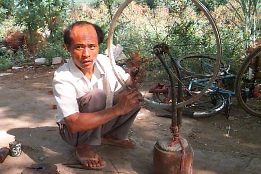 Truing a wheel in a rural bike repair shop