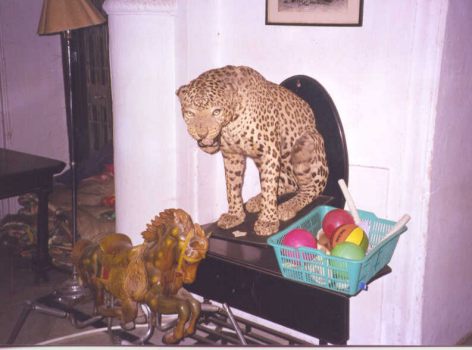 Stuffed kitty guards over Kota princling's toys