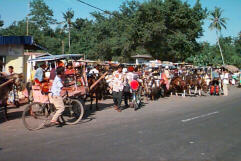 On the way to the port we worried about being able to make the boat on time. We hustled through the pulsing traffic composed of bikes, trucks, cars, horsecarts and pedestrians. The wind was with us and we passed all non-motorized traffic, finally arriving at the harbor with plenty of time to spare. The view from the Jet-Cat was spectacular. We cut our way in the narrow passage between Penida and Lembongan islands. Penida was lush and green rocky terrain tumbling to the sea, its shores cut with box shaped canyons filled with palms and with deserted sandy beaches. Lembongan, the neighbor island is shield-shaped, flat and dry.